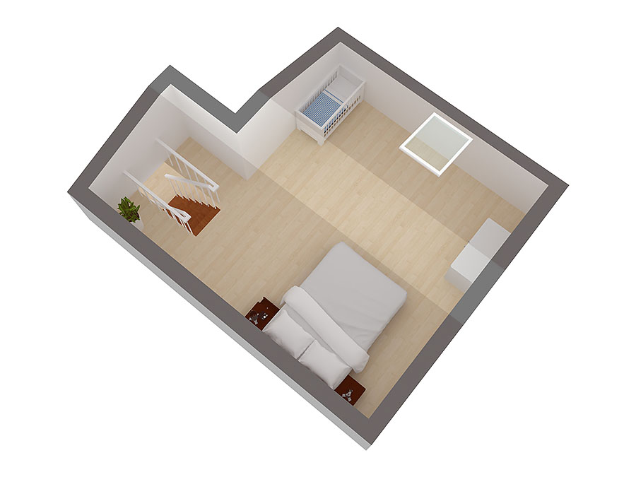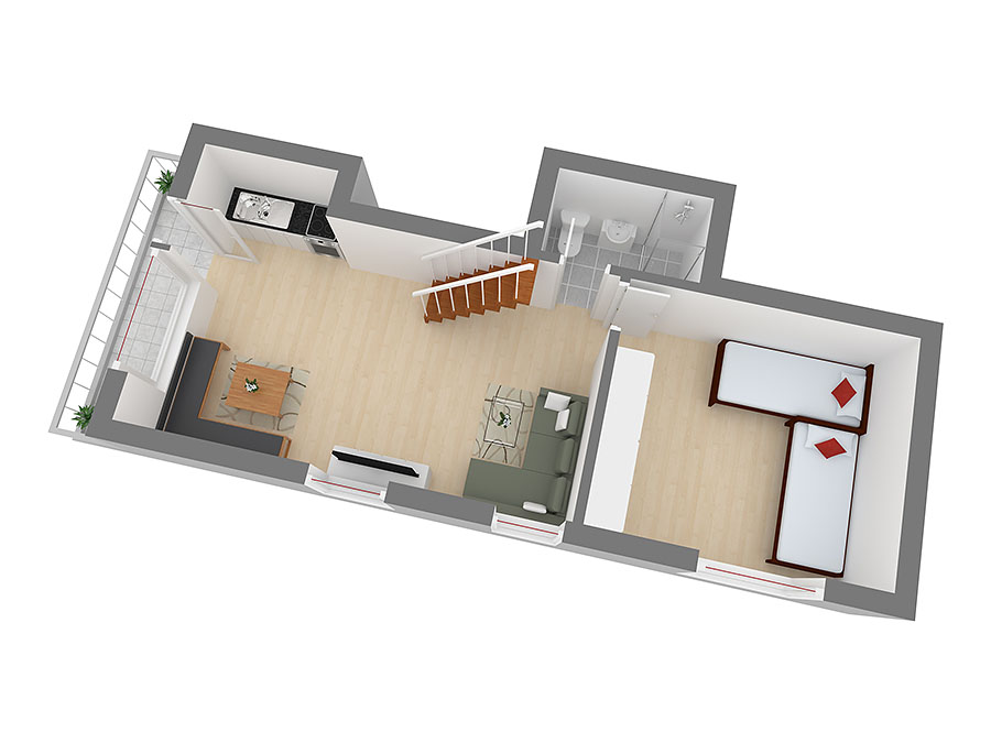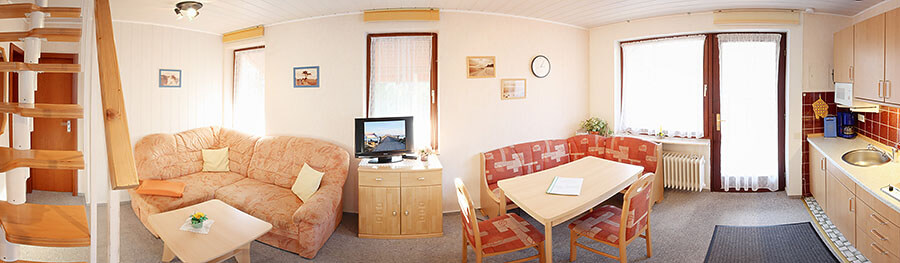Sie verfügt über einen Wohnraum mit Essecke, Küchenzeile mit 2-Platten-Elektroherd, Kühlschrank, Mikrowelle, Kaffeemaschine, Wasserkocher, Toaster, Eierkocher, einen Schlafraum mit zwei Einzelbetten, einen Schlafraum mit Doppelbett und Kinderbett im Dachgeschoss über eine Raumspartreppe zu erreichen, Dusche / WC.